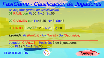 1. Resolver las cuestiones y/o expresiones en el videojuego lo más rápido posible, obteniendo la mayor puntuación y compitiendo con el resto de jugadores. FastGame, es un videojuego de habilidad y rapidez mental.